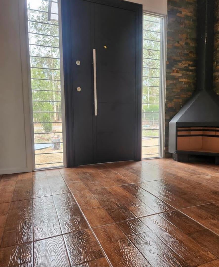 - Revestimiento exterior de fibrocemento imitación madera y lapacho, que combina durabilidad y estética.